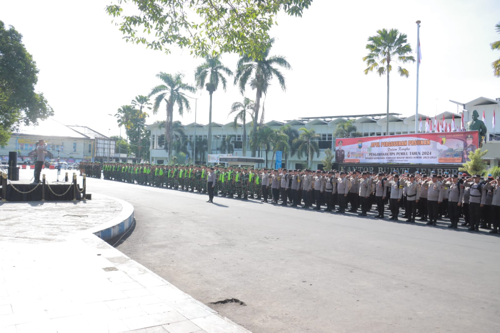 JEMBER, Pak JITU.com – Apel Pergeseran Pengamanan Pemilu 2024 dilaksanakan di Alun-alun Jember dipimpin Kapolres Jember AKBP Bayu Pratama Gubunagi dan Dandim 0824/Jember Letkol Inf Rahmat Cahyo Dinarso, pada Senin pagi (12/02/2024).