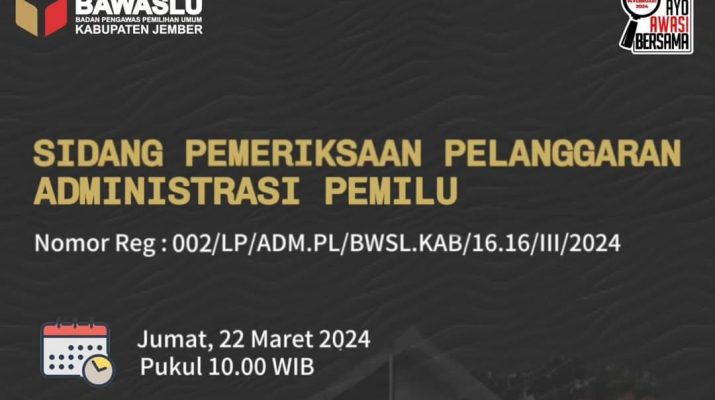 Ummul Mu’minat, Divisi Hukum dan Penyelesaian Sengketa Bawaslu Jember saat dikonfirmasi terkait Sidang Pemeriksaan Pelanggaran Administrasi tersebut menyebutkan bahwa sidang ini terkait dengan sidang sebelumnya, “Pelimpahan Laporan dari Bawaslu Jawa Timur,” ujarnya.